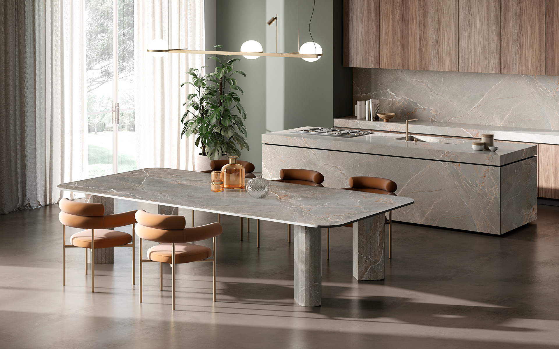 Thanks to their dimensions, machinability, weight, and thickness, Optimum Surfaces extra-large slabs are ideal for creating various furnishings for contemporary kitchens, including tables. Our porcelain stoneware tables, available in various shapes and effects, will serve as the central decorative focal point in your kitchen, seamlessly integrating with any style.