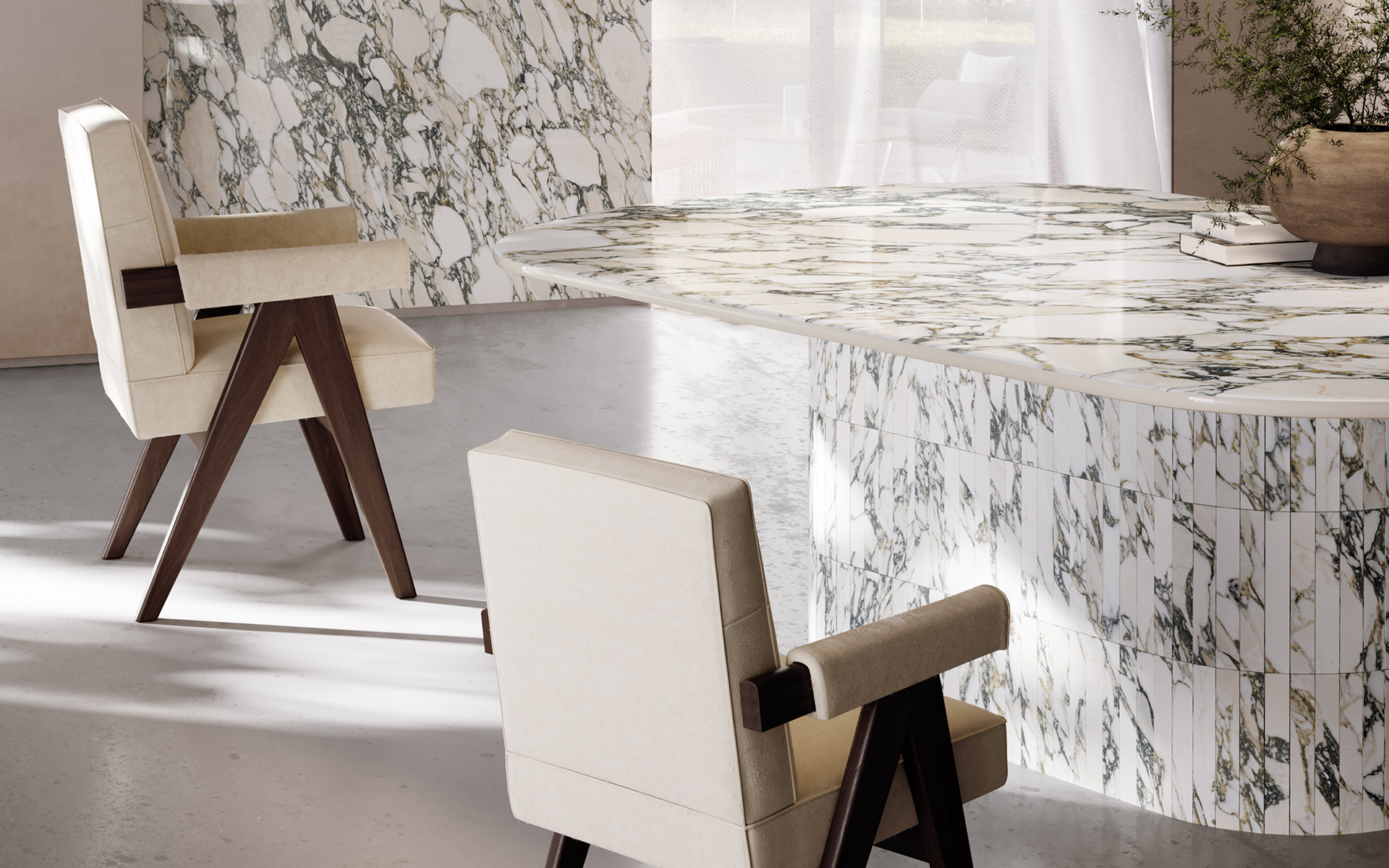 Given the extremely high technological standards achieved, Italian extra-large porcelain stoneware features a perfect reproduction of the visual and tactile aspects of the natural materials they imitate. Whether it is the veining of the marble effect, the minimalism of the stone-effect products, or the texture of the concrete-effect options, every pattern and colour is accentuated to perfection in Optimum Surfaces extra-large slabs.