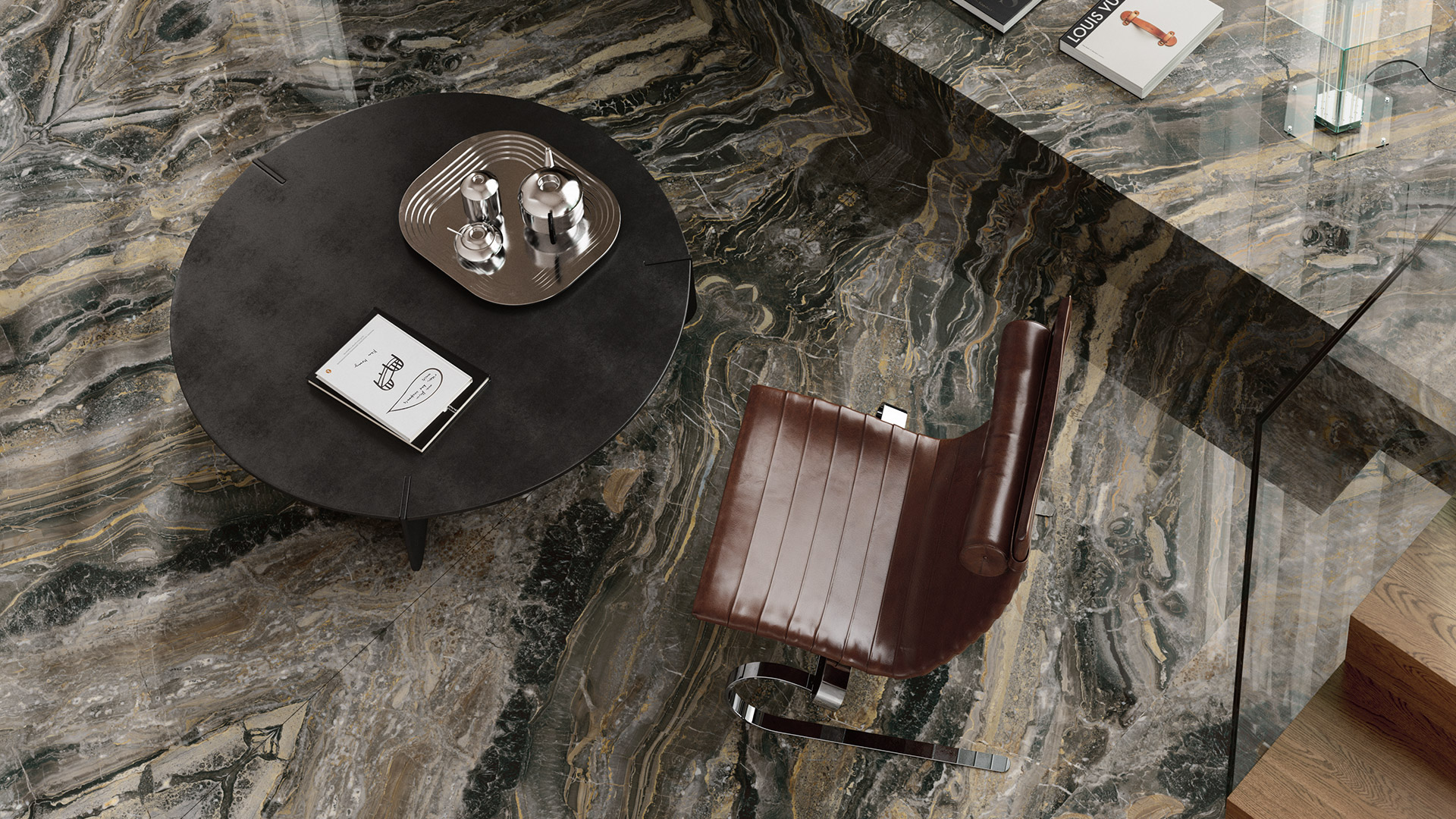 Zenith Storm reimagines the material intensity of Arabescato Orobico, one of the most iconic marbles from the Italian Orobie Alps. Its porcelain stoneware surface, in the exclusive 1840×3300 mm size, faithfully captures the wild elegance and chromatic richness of the natural stone. Undulating veining in burnished gold and anthracite tones flows across the surface like mineral currents in constant motion, shaping a powerful, scenic composition that adds energy and architectural depth to any space.