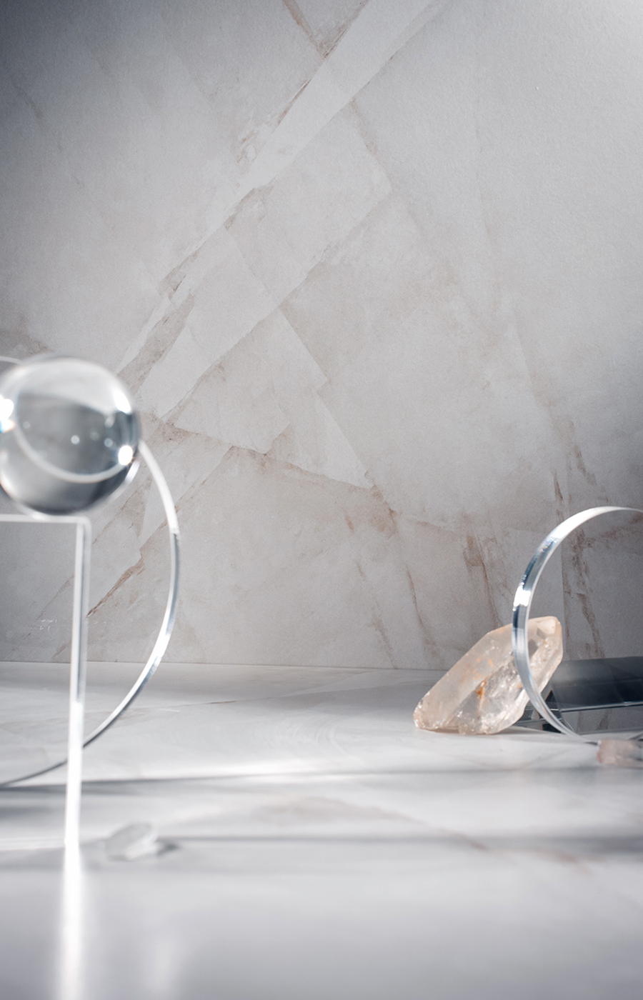 Delicate venature sembrano emergere dalla materia e suggeriscono i primi raggi luminosi che attraversano la pietra, accompagnando lo sguardo tra trasparenze soffuse e sovrapposizioni leggere. Grazie a una tecnologia capace di accogliere la luce e restituirla con spessore visivo, Alba rivela una materia sfumata e misurata, in cui ogni passaggio contribuisce a definirne il carattere raffinato.