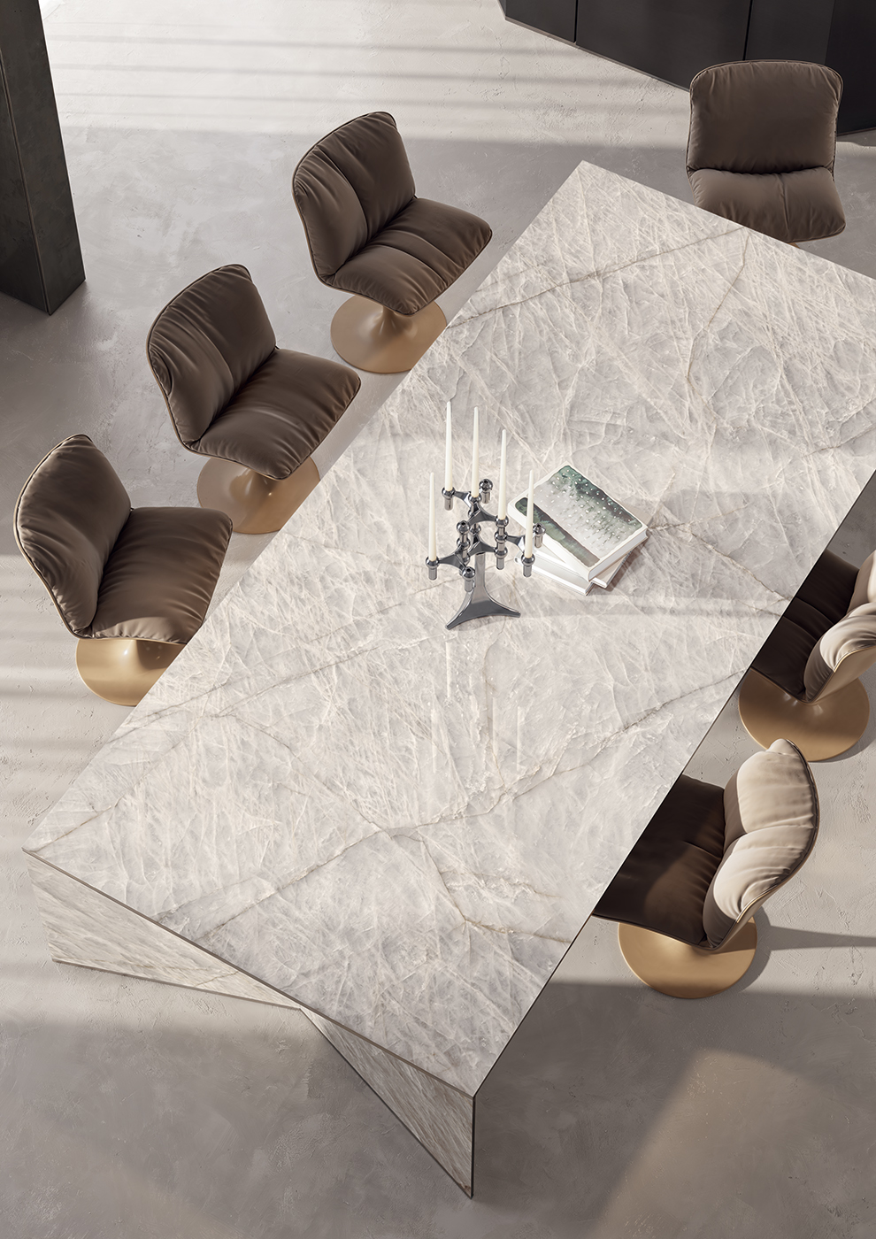 Alla base di questa ricchezza visiva c’è una tecnologia capace di trattenere la luce all’interno della lastra e di rivelare l’energia interna della materia attraverso un disegno complesso, attraversato da incisioni luminose, tracce cristalline e profondità diffuse. Ne emerge una texture potente e tridimensionale, in cui la luce amplifica traslucenze, rilievi e variazioni interne, esaltando il carattere della superficie con forza, nitidezza e precisione.